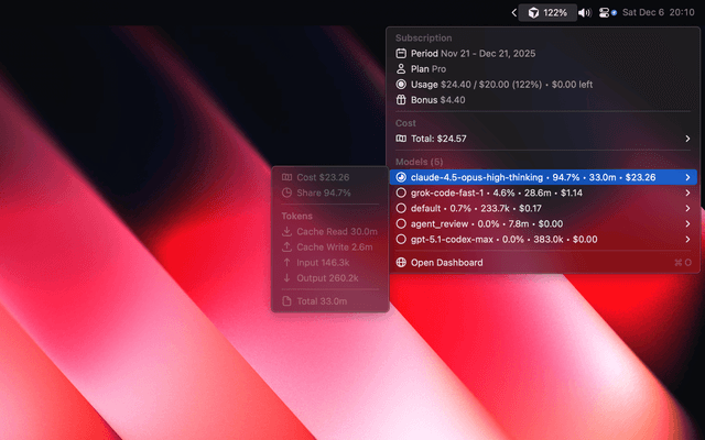 • Menu Bar Display — Shows usage percentage, cost, or both with customizable icon