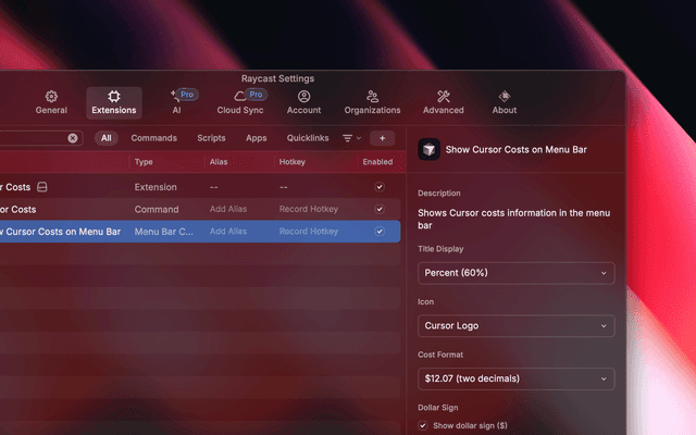 Track your Cursor costs in real-time directly from macOS menu bar with this Raycast extension.