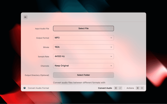 β”œβ”€β”€ convert-audio.tsx        # Audio format conversion command