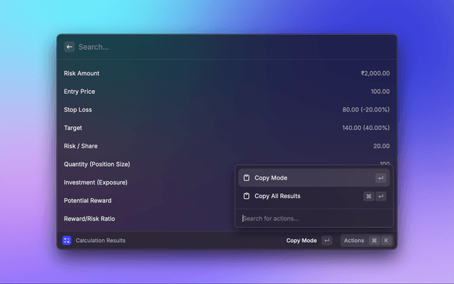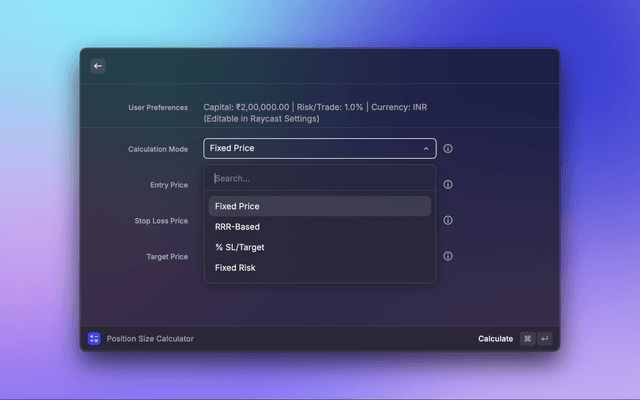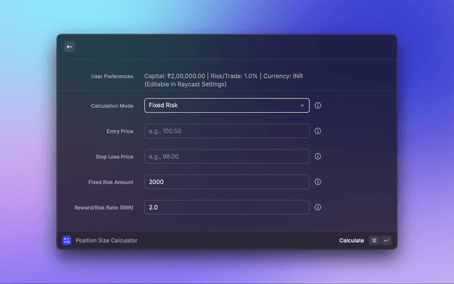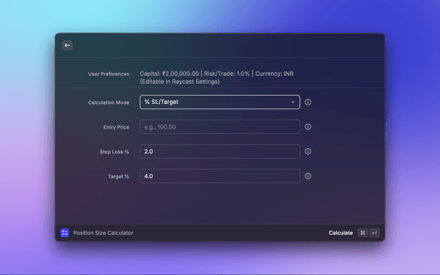 • Preference-Based Defaults: Set your default trading capital, risk percentage and currency in Raycast preferences for faster calculations.