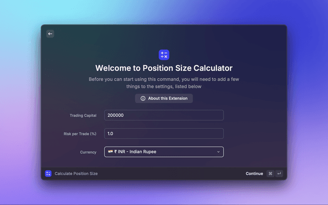 The Position Size Calculator is a Raycast extension designed to help traders quickly and accurately determine the appropriate position size for their trades. It considers your trading capital, risk tolerance, and various methods for defining stop loss and target levels. This ensures you manage risk effectively according to your trading plan.