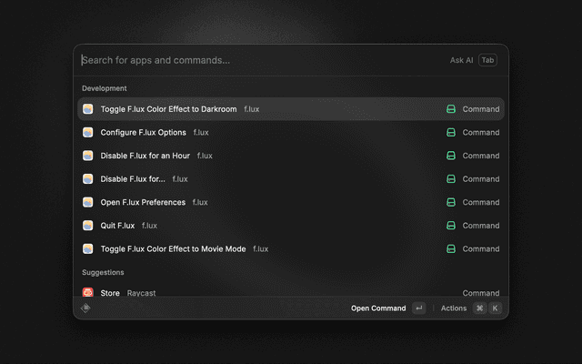 This extension provides quick access to f.lux controls without leaving Raycast: