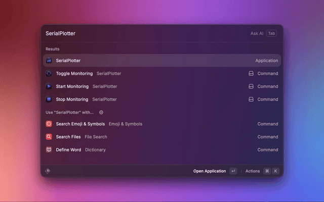 SerialCast allows you to control SerialPlotter through Raycast. Supports common monitoring functionality:
