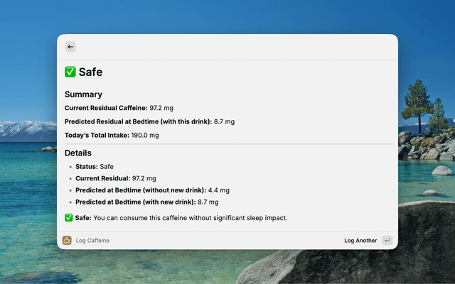 Instead of just tracking total daily intake, this extension estimates the remaining caffeine in your body using exponential decay calculations and uses that plus time of day to determine whether additional caffeine is likely to disturb your sleep.