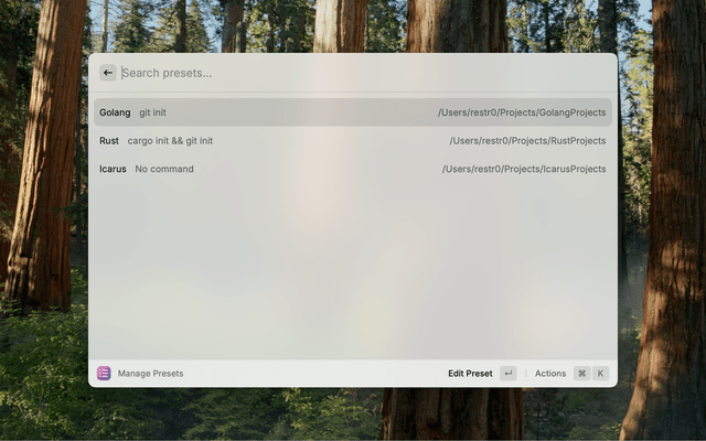 • Create Project Presets: Save your frequently used project folder locations, initialization commands and preferred IDE applications