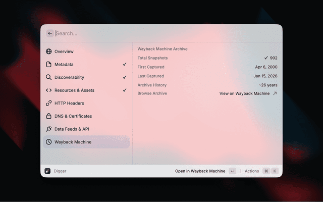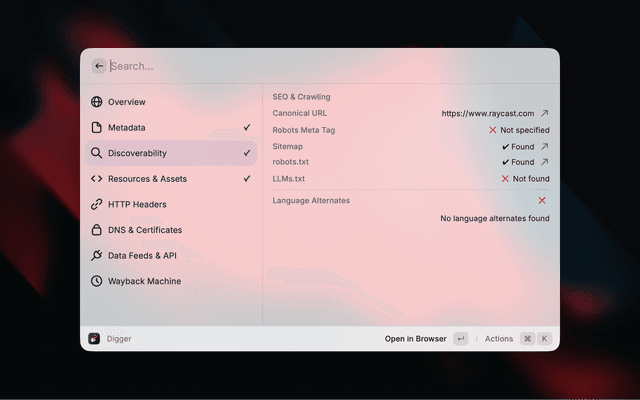 Digger surfaces contextual information about any website without needing to open developer tools. Enter a URL and instantly see metadata, SEO signals, security info, DNS records, and more.