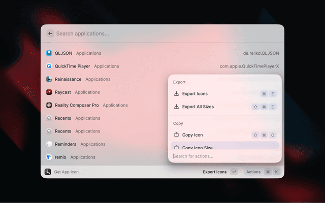 • Copy Icon (⌘⇧C): Copies the app icon at the largest enabled size to the clipboard as an image. You can paste it directly into design tools, documents, or chat apps.