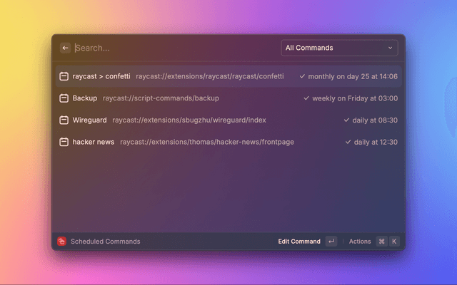 This extension allows you to schedule any Raycast command to run automatically at specific times or intervals. Perfect for automating repetitive tasks, running periodic checks, or executing AI commands on a regular basis.