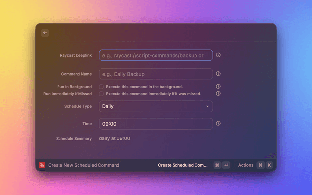 - Command: Paste the Raycast deeplink of the command you want to schedule
