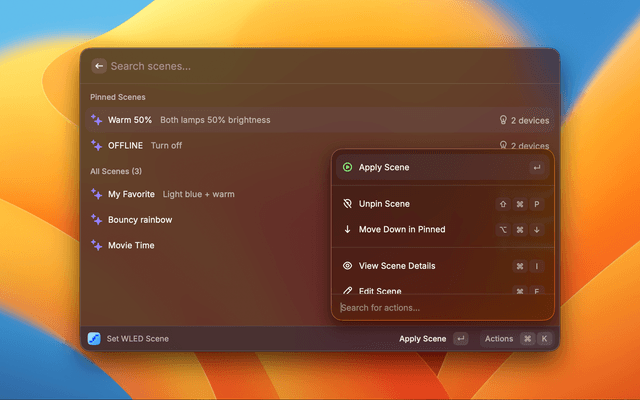Control your WLED LED strip devices directly from Raycast. Manage multiple devices, adjust colors, brightness, and apply effects with a simple, unified interface.