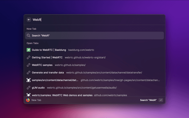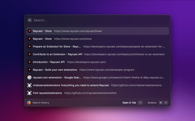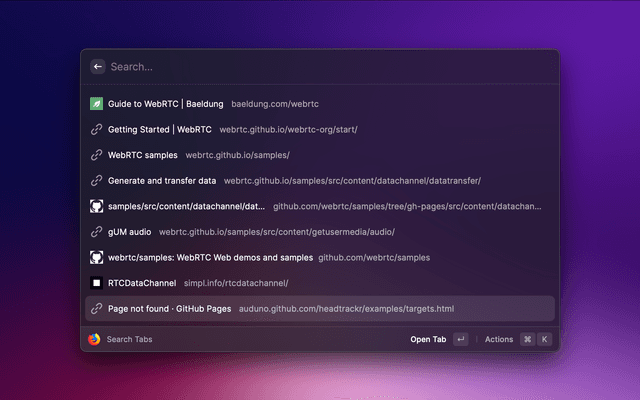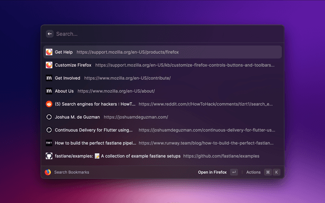 Search and open Mozilla Firefox tabs from search query, opened tabs, bookmarks and history.