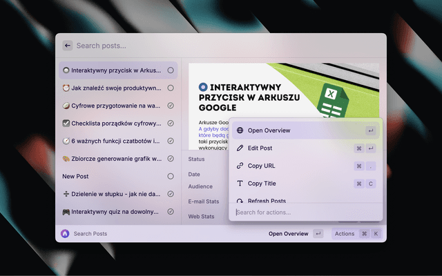 Integrate your Beehiiv publication with Raycast. Search posts & subscribers, drill-down into detailed analytics, copy links, refresh stats, and keep an eye on the latest campaigns – all without leaving your keyboard.