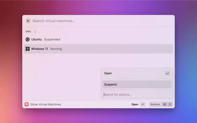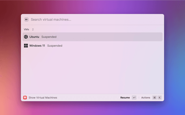 List virtual machines in Parallels Desktop. Open, start, resume, and suspend virtual machines.