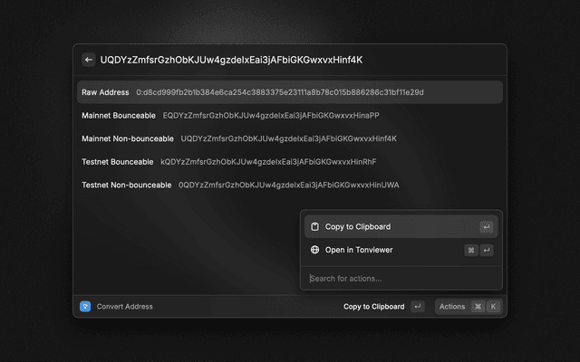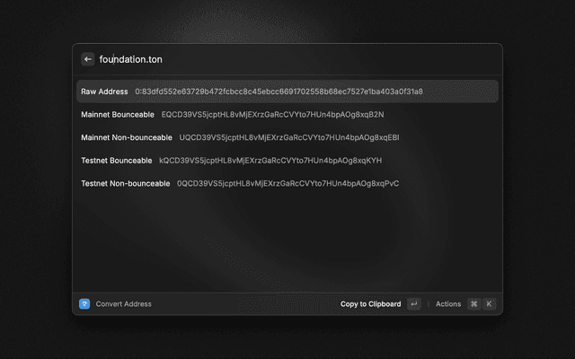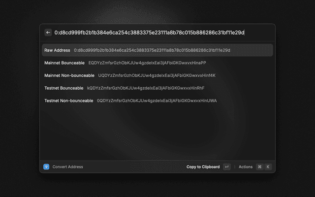 • Convert TON addresses between raw, bounceable, and non-bounceable formats