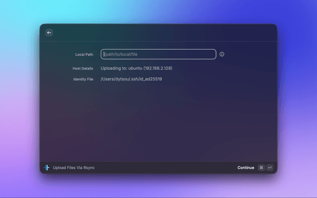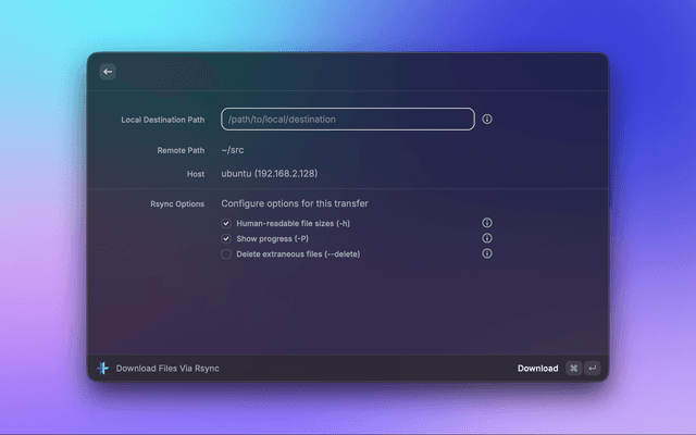 A Raycast extension for transferring files between local and remote servers using rsync with SSH config integration.