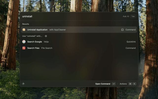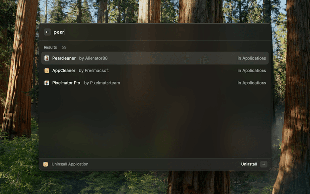 You can now pick any app as your uninstaller from the extension preferences. Make sure the selected app supports receiving an app path as an argument (e.g. via open -a <uninstaller> <app-path>). Apps like AppCleaner, Pearcleaner, TrashMe 3, and App Cleaner & Uninstaller are known to work well.