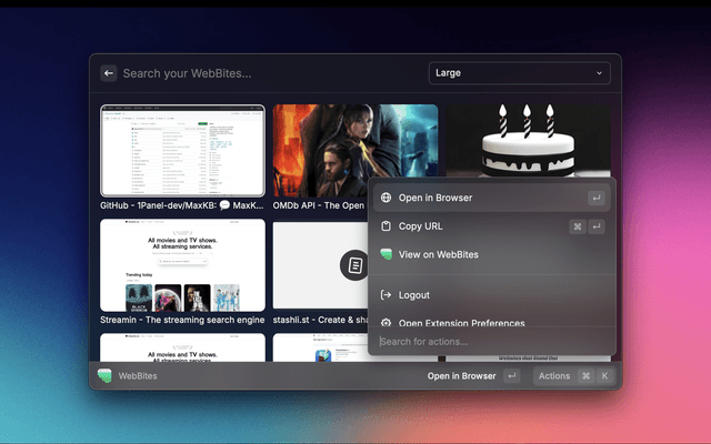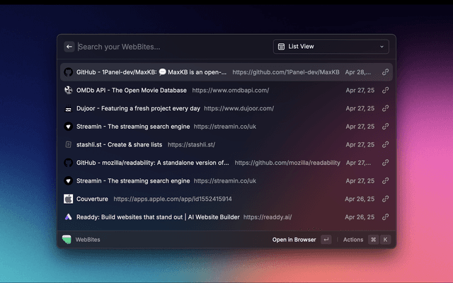 A Raycast extension for searching and managing your WebBites.io bookmarks.