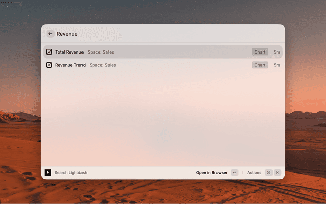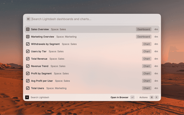 Search and open Lightdash Dashboards, Charts, and Spaces quickly.