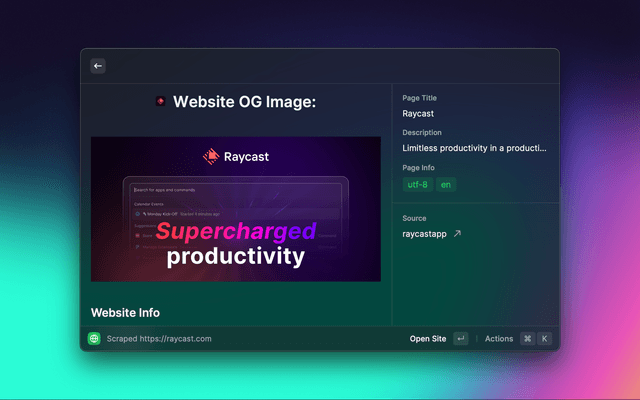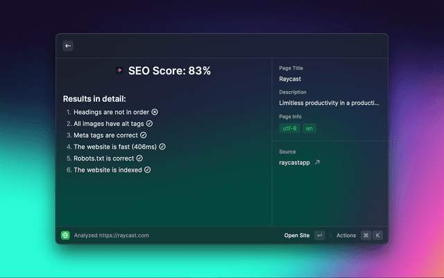 This Raycast Extension lets you audit a given webpage in a matter of seconds. It's made to showcase all critical data and tell you what is not optimized yet.