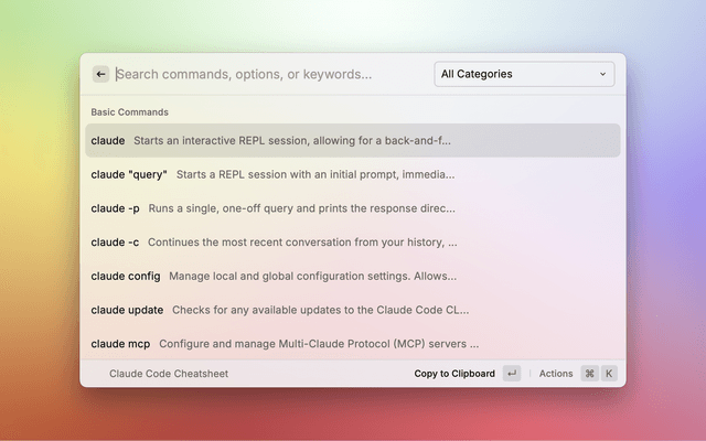 • Instant Search: Quickly find any Claude Code command, option, or keyword.