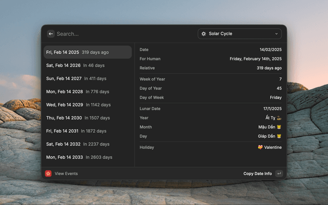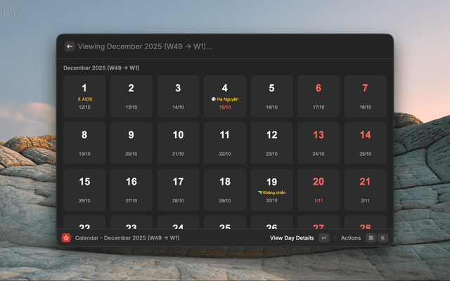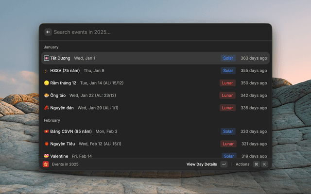 A comprehensive Vietnamese Lunar Calendar for Raycast. View Solar and Lunar dates, check holidays with anniversary counts, and navigate easily with shortcuts.
