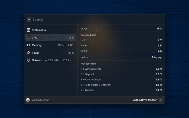 This is a Raycast extension that allows you to monitor your system's CPU, Memory, Disk and Battery usage.