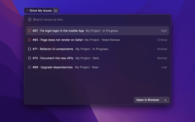This Raycast extension lets you quickly find Redmine issues.