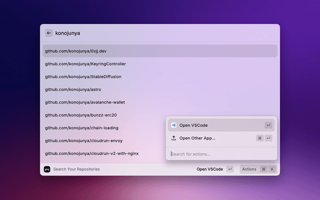 ghq extension is currently no plans to implement create, rm, and root because there are few situations where you want to use Raycast to perform these functions.