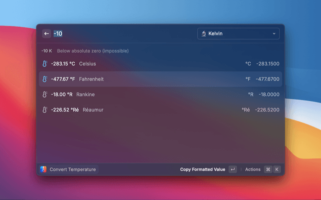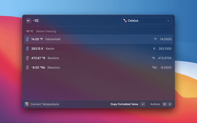 • ⌘↵ - Copy formatted value (e.g., "77.00 °F")