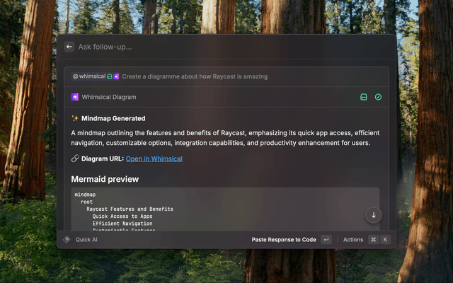 Smart Diagram Detection - AI automatically chooses the best diagram type for your description 🔄 Flowcharts - Perfect for processes, workflows, and decision trees 🧠 Mindmaps - Great for brainstorming and organizing ideas 📊 Sequence Diagrams - Ideal for system interactions and API flows 🎨 Professional Rendering - Powered by Whimsical's high-quality diagram engine ⚡ No Setup Required - Uses Raycast AI and Whimsical's public API