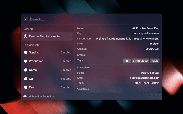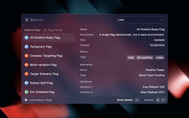 Quickly access and manage your LaunchDarkly feature flags directly from Raycast. View flag details, environments, and targeting rules without leaving your keyboard.