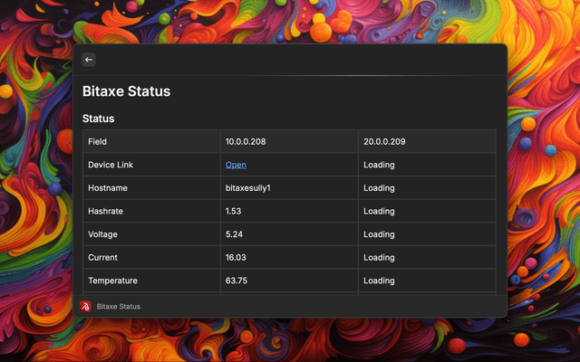 Display the status of one or more locally managed BitAxe miners in a quick reference table: