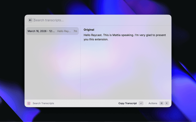 Search TranscriptsBrowse history, copy, save, delete, reveal in Finder