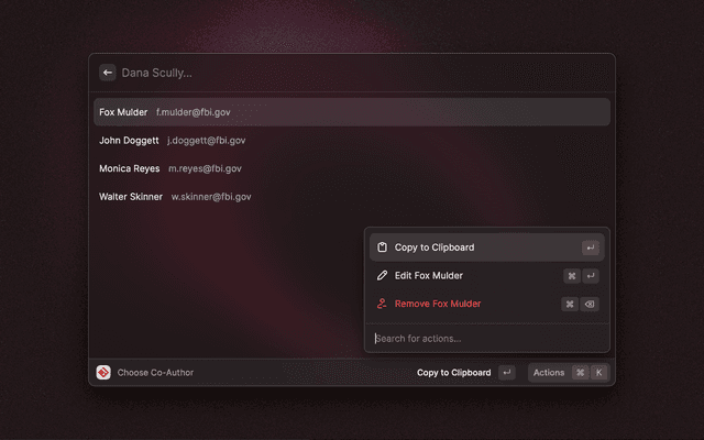 Quickly select co-authors and copy properly formatted Co-authored-by trailers for your Git commits.