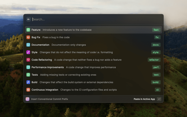 A Raycast extension designed to provide a reference list of the possible Conventional Commit prefixes enriched by the Angular Convention which can be inserted into the active window.