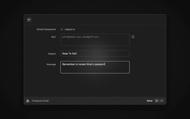 The fastest way to dash off a quick email to yourself and others. Inspired by Andrew Wilkinson's tweet.