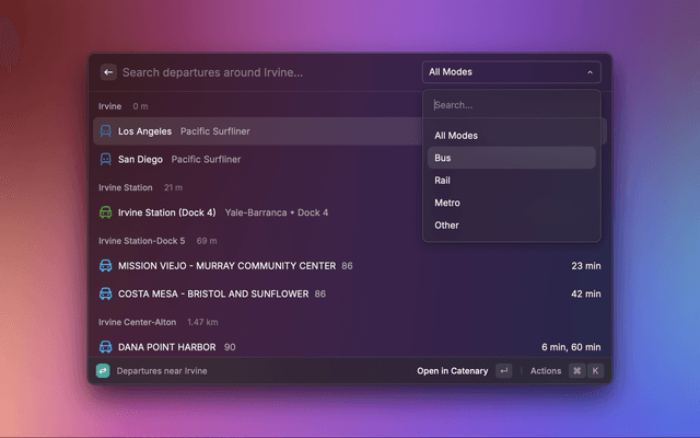 - Filters: Filter departures by mode (Bus, Rail, Metro, etc.).