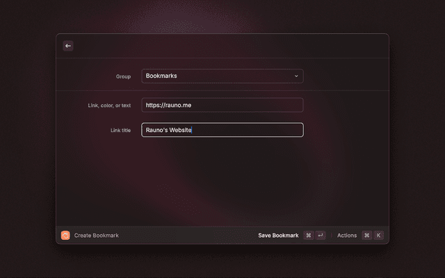 Create a new bookmark, whether it's a URL, a color, or a note. You can also select a group to save the bookmark to.