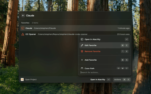 Can I use a different terminal? Supports Terminal.app, Alacritty, and Ghostty. Choose your preferred terminal in extension preferences.