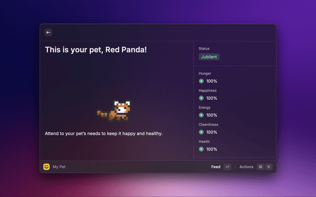 A virtual pet in your Raycast menu bar. Feed, play with, and care for your virtual companion to keep it happy and healthy.