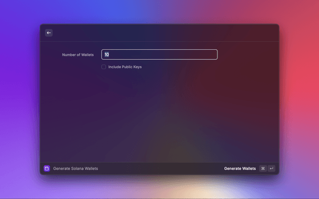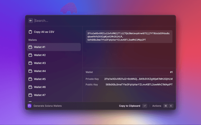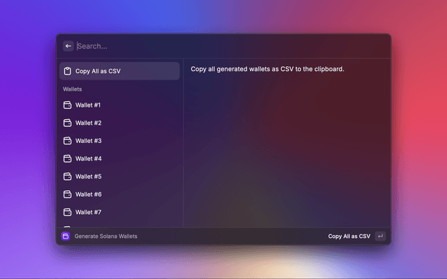Introducing the Solana Wallet Generator, a powerful Raycast extension designed for developers and cryptocurrency enthusiasts seeking to efficiently create multiple Solana wallets. This tool streamlines the wallet generation process, allowing users to produce thousands of wallets swiftly and securely.