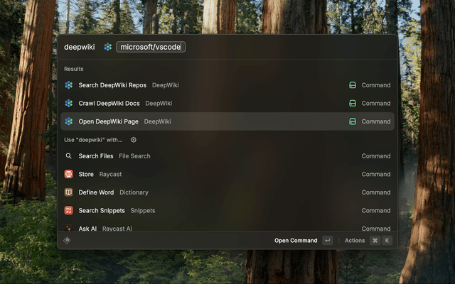 - Search DeepWiki Repos: Search for repositories indexed by DeepWiki directly within Raycast.