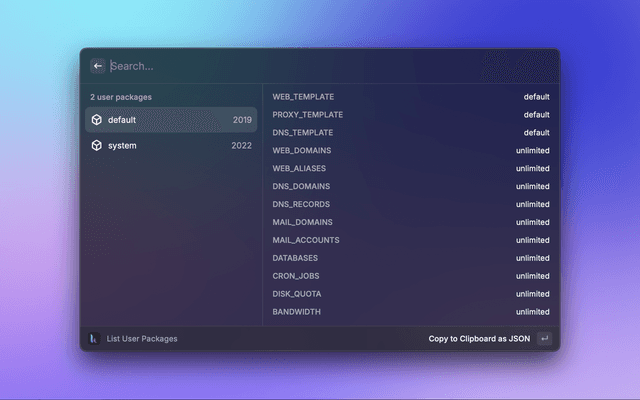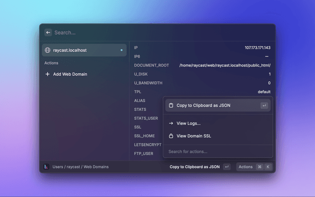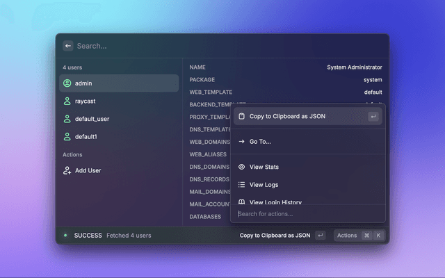 This is a Raycast extension for Hestia Control Panel Admin level accounts. With this extension you can manage Users, Domains, Mail Domains, Databases, Cron Jobs and more (see the last section for table of what is included).