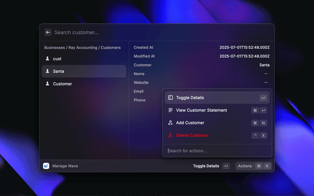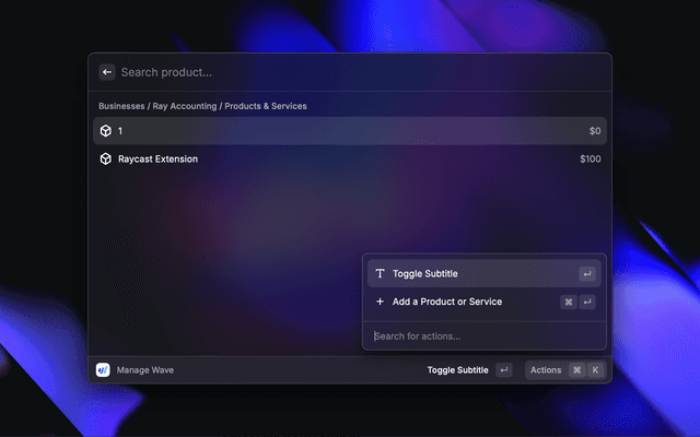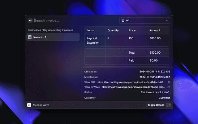This is a Raycast extension for Wave. It allows you to view your Wave Businesses and their associated Invoices, Customers and even some Customer Statements ๐Ÿ‘€.