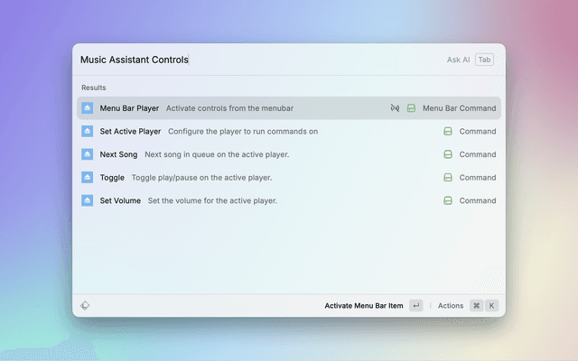 Control Music Assistant from anywhere on macOS and keep the current track in your Raycast menu bar.